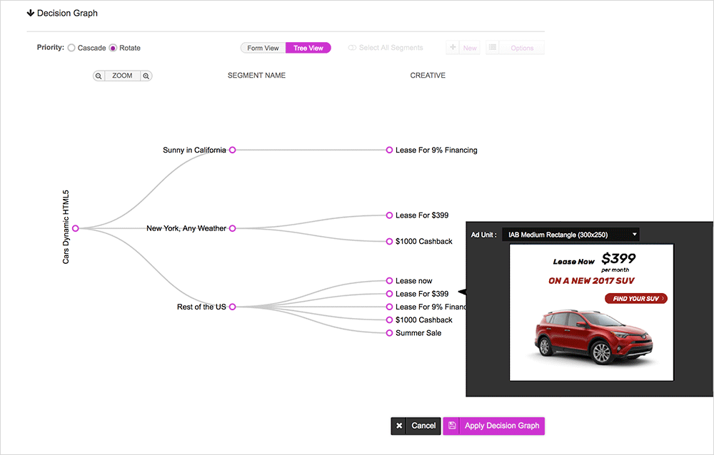 The Decision Graph technology and APIs provide marketers with a broad set of choices of technologies and platforms, seamlessly tying them together into a single harmonious workflow. For example, creative output from one vendor can be uploaded and easily married to data from yet another vendor and then delivered post-personalization by Jivox IQ to a media platform. Moreover, users will be able to stay within a single creative or media planning workflow, avoiding time-wasting hops across platforms.