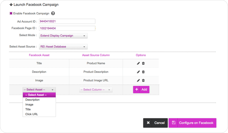 - Simple setup to launch a Facebook ad campaign: choose between extending a Display or using Facebook data