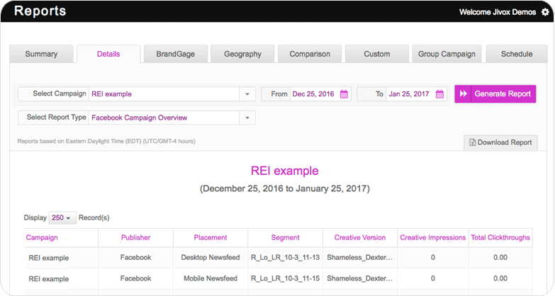 | Programmatically monitor Facebook campaign performance | Easy to monitor Facebook and Display campaign performance—in Jivox Console |